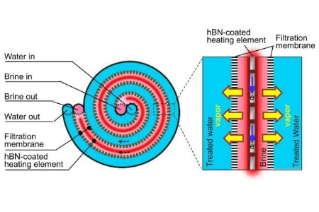 A thin coating of the 2D nanomaterial hexagonal boron nitride is the key ingredient in a cost-effective technology developed by Rice University engineers for desalinating industrial-strength brine.